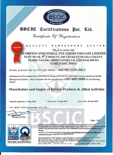 Standard Certification of - - Scorpion Industrial Polymers Private Limited Management System Certification Product Certification Name : BSCIC certifications Pvt. Ltd. Reference : BN5789/5220:0812 Issued By : Managing director of BSCIC Validity Period : 8/11/2012 12:00:00 AM To 8/10/2015 12:00:00 AM Range : Original Email to this supplier BROWSE MORE PRODUCTS From To Scorpion Industrial Polymers Private Limited Comments Your message must be between 20-8000 characters Add Additional Attachments for this Bus. Enquiry File Format Allowed (Dwg, Dxf, Jpeg, Jpg, Gif, Png, PDF, PPT, Word or Excel) | Maximum File Size : 10MB Submit